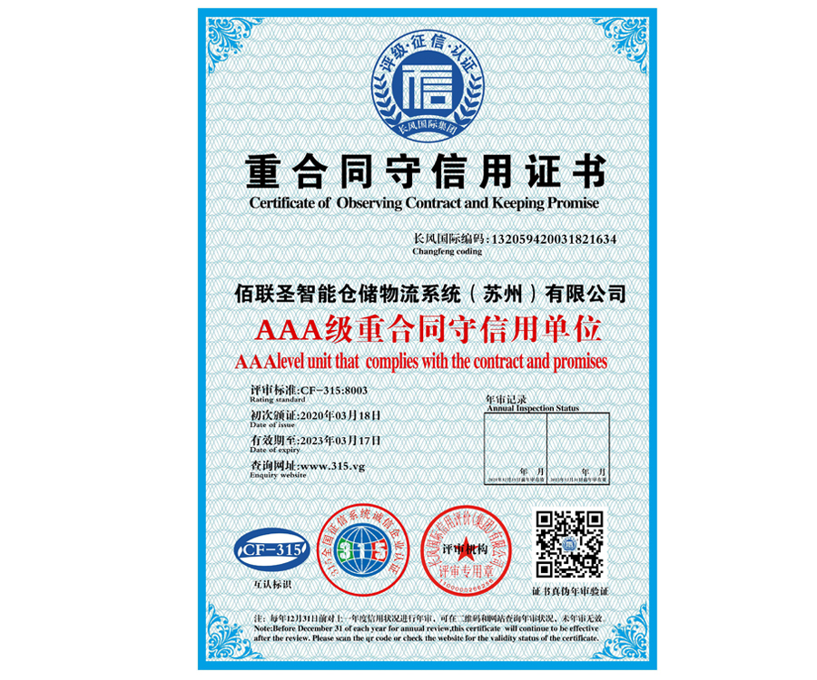 名稱: 重合同守信用證書